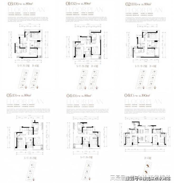 小面积产物,89-190㎡3-4房,楼栋布局均为中低区3T5,高区3T4,高度为43F。户型有约89㎡三房二卫,高区有约190㎡四房三卫,由两个D户型归并而成。