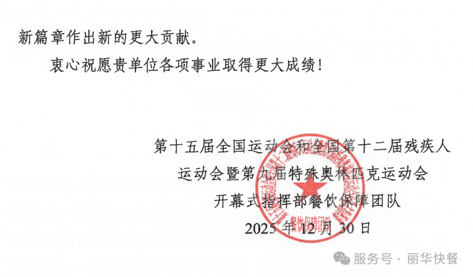 这封感激信,不只是对丽华快餐本次办事的必定,更是对丽华快餐取中国成长同步走了三十多年平易近族品牌的褒。