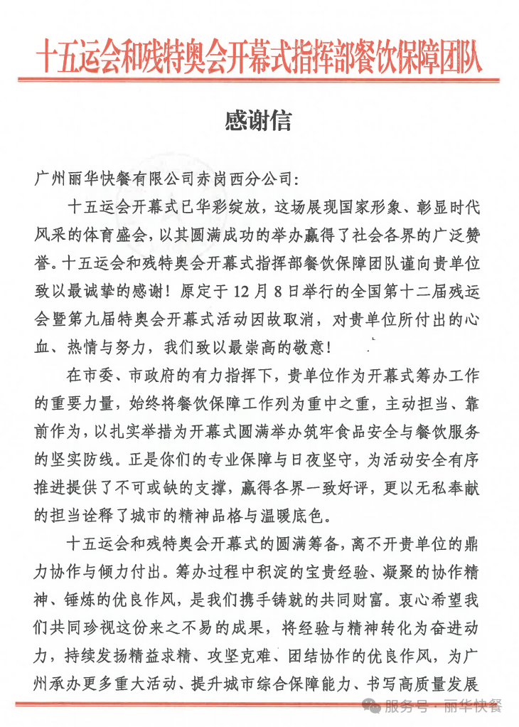 这封感激信,不只是对丽华快餐本次办事的必定,更是对丽华快餐取中国成长同步走了三十多年平易近族品牌的褒。